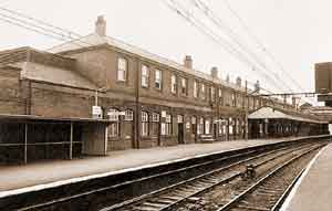 On Guide Ln, Hooley Hill. View looking west showing the southern platforms and office building. Platform 3 is on the right and Platform 4 is on the left.