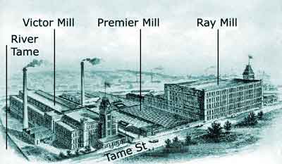 This former mill was located on the south-west side of Tame St and it was bordered by the river Tame to the south.