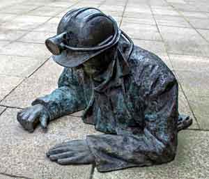 The statue shows a miner emerging from the ground and it was unveiled in 2008. It is situated on Market Ave, Ashton-under-Lyne, on the corner of Wood St.