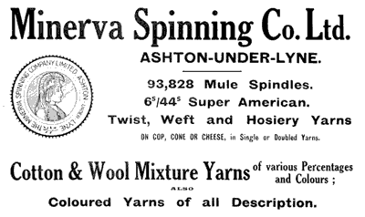 This former cotton spinning mill was located at the bottom of Minerva Rd in the Whitelands District of Ashton, and it was in a 90° bend in the river Tame. Its neighbour to the east was Texas Mill at the bottom of Texas St. The mill was built in 1891/92 for the Minerva Spinning Co Ltd and this company was the founder member of the Ashton Syndicate. This syndicate was a consortium of investors responsible for financing the construction of seven large cotton spinning mills in Ashton-under-Lyne during the early 20th century. The primary members of the syndicate, all directors of the Minerva Spinning Co Ltd, were: Edwin Barlow, George Henry (Harry) Coop (1866-1922), Lees Hyde Marland (1863-1925), Samuel Newton, John William Pollitt (1867-1930), and Joseph Boothby Pownall (1864-1911). In 1921 the Ashton Syndicate was re-floated as the Atlas Mills Group (Atlas Mills Ltd). The seven mills in Ashton were: Atlas, Cedar, Curzon (aka Alger), Minerva, Rock, Texas, and Tudor.