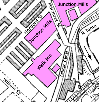 Junction Mills was a large complex of cotton-spinning mills and weaving sheds located to the west of the Portland Basin, between Welbeck St and Margaret St with another range to the west of Margaret St. They were founded in 1831 by Samuel Heginbottom and expanded between 1831 and 1890. His sons, William and George, were business partners and The London Gazette records in 1850 that the business was styled Samuel Heginbottom & Sons and that at this time Samuel stepped down to leave his sons to continue the business. It was incorporated in c.1896/97 as Heginbottom & Sons Ltd.
