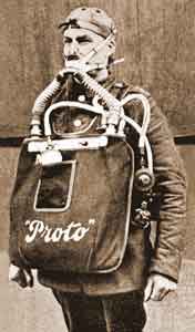 A self-contained breathing apparatus, the Proto recycled carbon monoxide into the chest-mounted breathing bag, purified it with sodium carbonate and with the aid of the oxygen contained in the cylinders it permitted the user to have clean air for breathing. By regulating the amount of oxygen stored in the bottles it was possible to work in a contaminated atmosphere for over two hours.